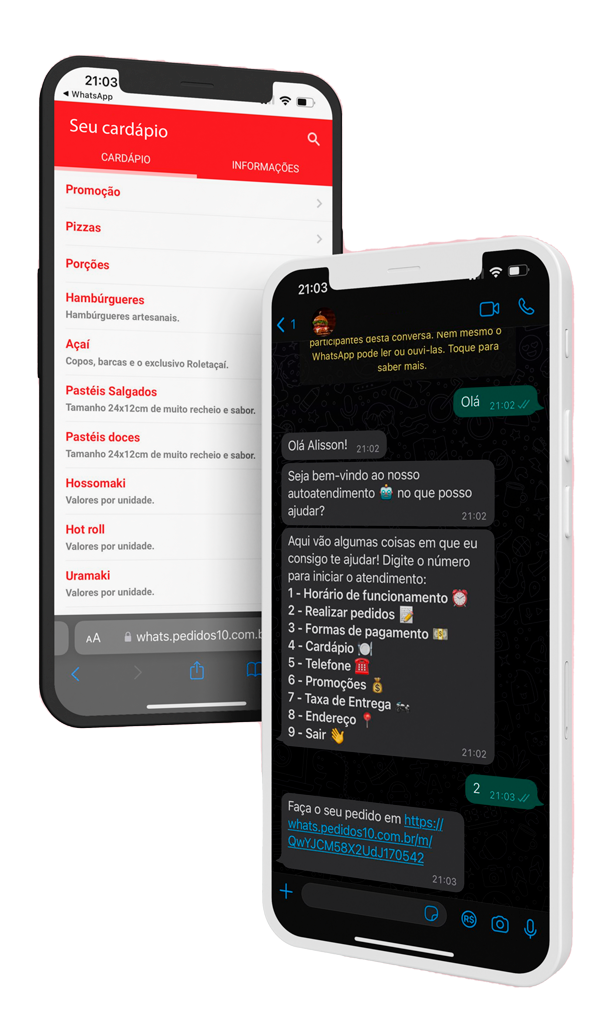 Chega de filas no WhatsApp e dor de cabeça para atender um a um. Com nosso Atendente Virtual, o seu cliente é direcionado para o Cardápio Digital. Assim que o pedido for efetuado, ele será impresso diretamente na cozinha ou no caixa do seu estabelecimento. Simples e fácil!