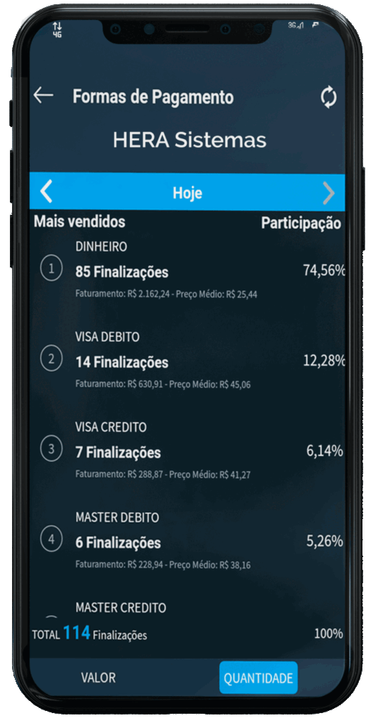 • Formas de pagamentos mais utilizadas (Dinheiro, Cartão)